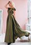 Длинное вечернее платье цвета хаки с рюшами на рукавах и закрытой спинкой.