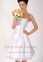 Короткое свадебное платье для весёлой и озорной невесты. Открытый лиф задрапирован лёгкой тканью. Его нижняя граница обозначена вышивкой из бисера. Гладкая юбка доходит всего лишь до середины колена. А из-под этого гладкого верхнего слоя кокетливо выглядывают прозрачные оборки. В наличии размеры 42, 44; цвета белый и айвори.