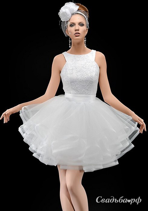 Кокетливое свадебное платье из коллекции 2013 года создано для самых притязательных ценительниц прекрасного. Оригинальный корсет со скромной зоной декольте вручную расшит бисером. Короткая юбочка чуть выше колен отличается пышностью и лёгкостью. В наличии представлен размер 44. Другие размеры доступны под заказ.