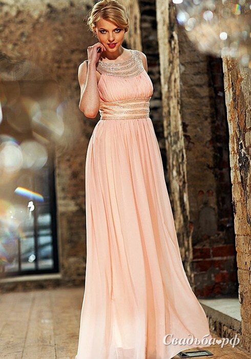 Красивое вечернее платье в греческом стиле. Округлый вырез расшит четырьмя ярусами стразов. Лиф задрапирован мягкими складами ткани. Линия талии выделена очень широким декоративным поясом, также украшенным линиями стразов. Юбка длинная, очень широкая, лёгкая. Модель представлена в разных цветах. Размеры в наличии 42, 44, 46, 48, 50.
