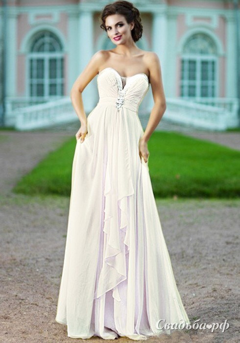 Лёгкое свадебное платье в белом цвете украшено диагональной драпировкой на лифе. Безумно красивый лиф декорирован десятками стразов. Пояс, подчеркивающий талию, также украшен брошью со стразами. Мягкие воздушные складки, ниспадающие к полу, делают платье сказочно красивым и чудесным. Невеста, облаченная в данное свадебное платье, как цветок весной: расцветает и радует окружающих своим шармом, таинственностью, элегантностью и великолепием.