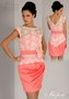 Очаровательное вечернее платье с закрытой зоной декольте и V-образным вырезом на груди. Верхняя часть наряда выполнена из ажурного кружева. Кокетливая баска сзади выполнена в форме клина. Талия подчёркнута широким поясом и объёмной розой. Облегающая юбка доходит до середины бедра. Такое платье идеально садится по фигуре.