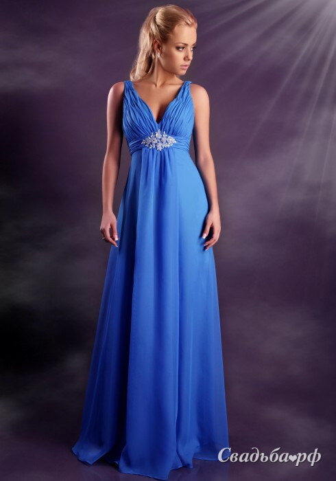 Вечернее платье с лямочками и расшитым корсетом. Модель выполнена из лёгкого шифона. Лиф с глубоким V-образным вырезом украшен драпировкой. Под грудью проходит широкий пояс, на нём расположена очень красивая вышитая композиция из бисера и бусин. Длинная широкая юбка мягко струится вдоль фигуры и волнами ниспадает на пол.