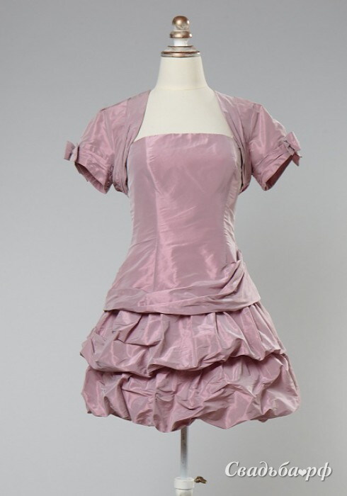 Короткое вечернее платье. Прямой лиф и корсет модели выглядят строго и элегантно. А пышная юбка, состоящая из двух объёмных оборок, - игриво и кокетливо. Болеро с короткими рукавами, украшенными бантиками, идеально дополняет платье. Уточнить информацию о наличии платья Вы можете, позвонив в наш салон. Тел.: (495) 691-6169