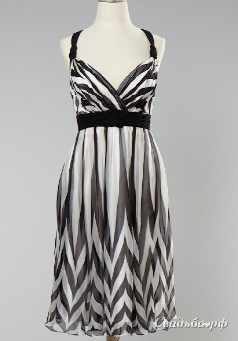 Элегантное вечернее платье из легкого шифона с оригинальным чёрно-белым принтом. Глубокий V-образный вырез плавно переходит в бретели. Под грудью проходит широкий пояс, украшенный объёмной тканевой розой. Юбка средней длины мягко струится вдоль фигуры. Уточнить информацию о наличии платья Вы можете, позвонив в наш салон. Тел.: (495) 691-6169