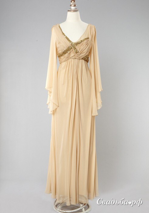 Романтичное вечернее платье из лёгкого шифона. Глубокий V-образный вырез украшен оригинальной асимметричной драпировкой и тесьмой из сверкающих стразов. Длинные свободные рукава смотрятся изысканно и нежно. Широкая мягкая юбка спокойными волнами ниспадает на пол. Уточнить информацию о наличии платья Вы можете, позвонив в наш салон. Тел.: (495) 691-6169