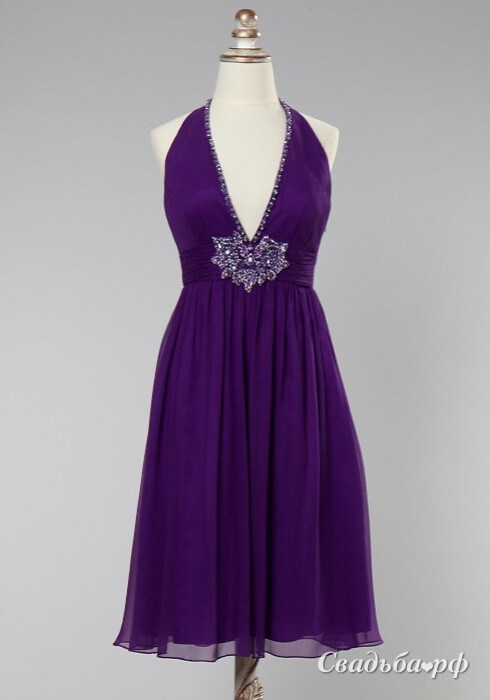 Элегантное платье из лёгкого фиолетового шифона с V-образным вырезом. Контуры выреза отделаны стразами. Завышенная линия талии выделена широким поясом. В центре пояса расположена изысканная декоративная композиция, расшитая бисером и бусинами. Уточнить информацию о наличии платья Вы можете, позвонив в наш салон. Тел.: (495) 691-6169