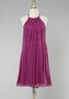 Утончённое вечернее платье средней длины из шифона тёмно-розового цвета. Свободное лёгкое платье волнующе струится вдоль фигуры. Очаровательная композиция из объёмных тканевых цветов расположена на груди. Бретели задекорированы блестящей тесьмой. Уточнить информацию о наличии платья Вы можете, позвонив в наш салон. Тел.: (495) 691-6169