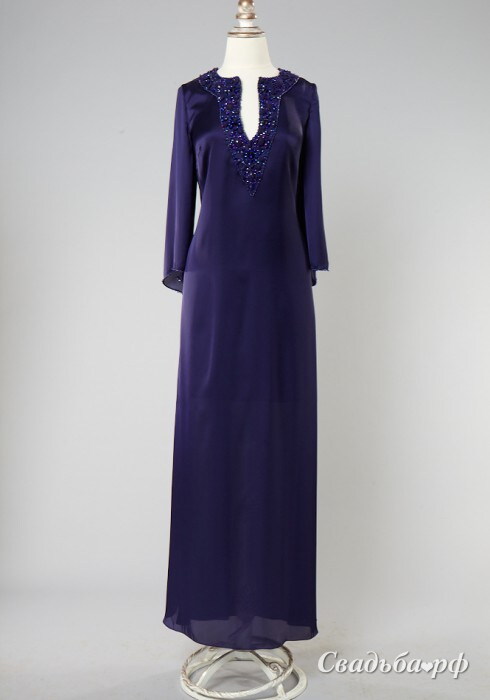 Элегантное вечернее платье с фигурным вырезом. Вырез отделан россыпью сверкающих стразов. Свободные рукава идеально сочетаются с полуприлегающим силуэтом модели. Юбка длинная, неширокая. Уточнить информацию о наличии платья Вы можете, позвонив в наш салон. Тел.: (495) 691-6169