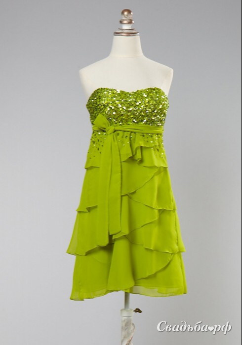 Кокетливое вечернее платье салатового цвета. Открытый лиф модели полностью расшит сверкающими пайетками. Завышенная линия талии выделена широким гладким поясом, завязанным на бант. Несколько ярусов лёгких оборок мягко струятся вдоль фигуры. Уточнить информацию о наличии платья Вы можете, позвонив в наш салон. Тел.: (495) 691-6169