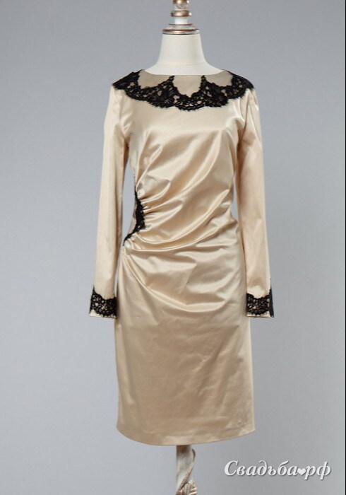Очаровательное шёлковое вечернее платье средней длины. Вырез, боковой шов и манжеты длинных рукавов отделаны чёрным кружевом. Небольшая драпировка спереди выглядит элегантно и стильно. Уточнить информацию о наличии платья Вы можете, позвонив в наш салон. Тел.: (495) 691-6169
