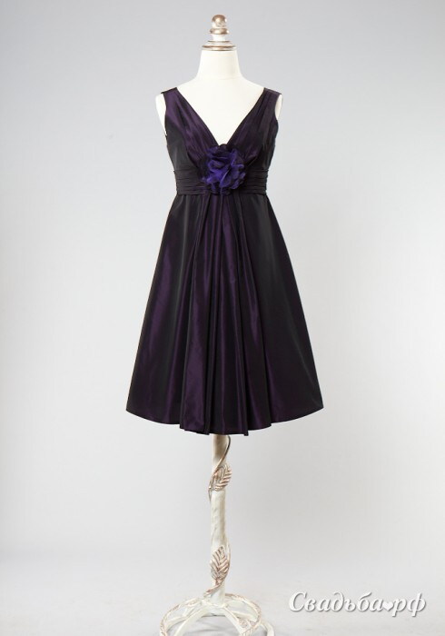 Изысканное вечернее платье с завышенной линией талии. Модель выполнена из роскошного струящегося шёлка. Глубокий V-образный вырез, украшенный драпировкой, плавно переходит в бретели. Под грудью проходит широкий пояс, в центре которого расположен большой тканевой цветок. Широкая юбка средней длины мягкими складами ниспадает вдоль фигуры.