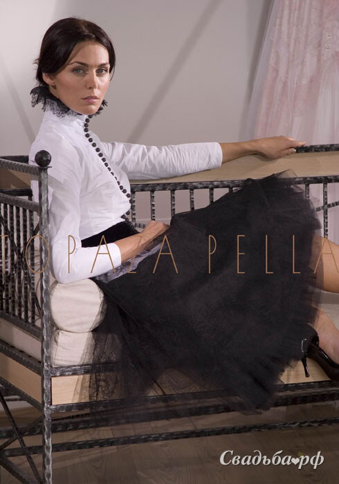 Элегантное вечернее платье с пышной юбкой из фатина. Закрытый воротник-стойка отделан изысканным кружевом. По центру передней части проходит вертикальный ряд круглых пуговиц. Пышная юбка средней длины фиксируется на талии широким поясом. Обязательно узнайте, в каком салоне есть эта модель платья. Тел. : (495) 691 - 6169, (495) 625 – 1082