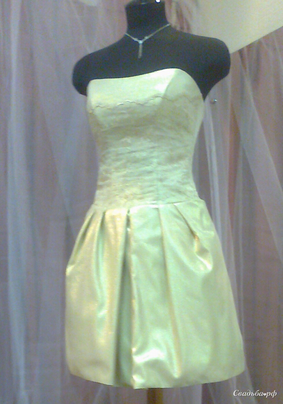 Короткое платье из золотой тафты с кружевным лифом из золота.