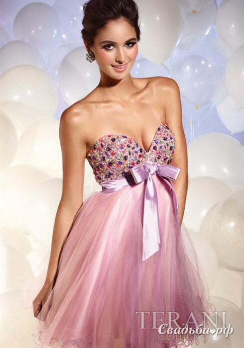 Очаровательный вечерний наряд от известного американского бренда Terani Couture просто создано для юных чаровниц. Миниатюрный корсет с соблазнительной зоной декольте вручную украшен разноцветными камнями. Атласная лента с кокетливым бантом подчёркивают завышенную талию и привлекают внимание к бюсту. Пышная юбка доходит до колен.