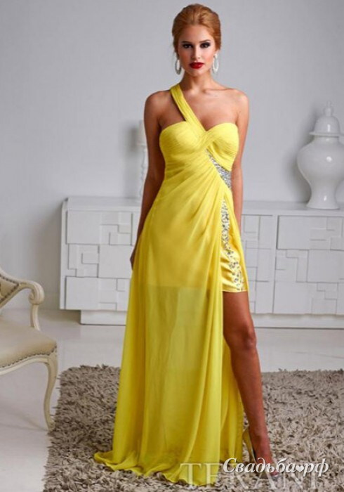 Эффектное вечернее платье солнечного ярко-жёлтого цвета. Основу модели составляет короткое прямое платье с драпированным лифом, украшенное россыпью стразов. Длинная широкая юбка с высоким разрезом начинается непосредственно под лифом, мягко окутывает фигуру и ниспадает на пол. Платье выглядит изысканно и соблазнительно одновременно.