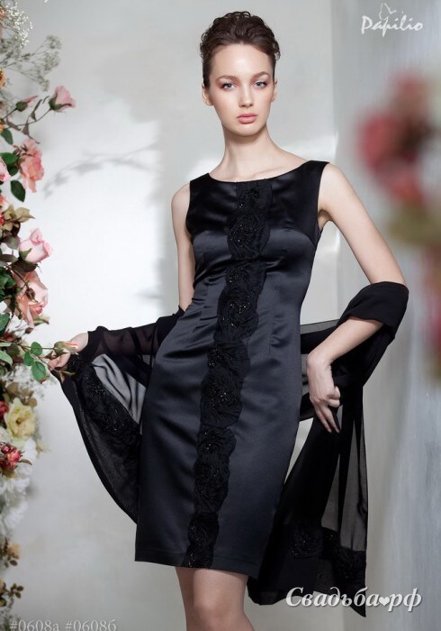 Облегающее чёрное платье с вырезом-лодочкой на груди и оголёнными плечиками подчеркнёт достоинства Вашей фигуры. Юбка кокетливо приоткрывает колени своей обладательницы. Элегантная модель с лаконичным дизайном. Вертикальная вставка расшита стеклярусом. Особенно стильно этот наряд смотрится с палантином. Цена палантина – 4700 рублей.