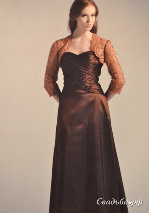 Терракотовое вечернее платье с драпированным корсетом и открытой зоной декольте особенно стильно смотрится в комплекте с кружевной накидкой-болеро. Длинная юбка постепенно расширяется к полу и зрительно вытягивает силуэт. Роскошный наряд для любого торжества. В наличии 56 размера, уточнить наличие данной модели Вы можете по телефону 8(495)930-9970.