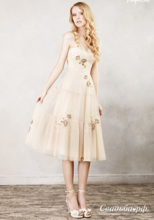 Очень нежное платье темно-кремового цвета придётся по душе самым романтичным натурам. Драпированный корсет и пышная юбка чуть ниже колен декорированы контрастными бутонами ручной вышивки. В наличии представлен 44 размер. Получить всю интересующую вас информацию о модельном ряде вы можете по телефону 8(495)-930-9970.