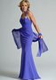 Изысканное вечернее платье с американской проймой дополнено лёгким шарфом. Представленный наряд из сине-сиреневого шифона декорирован сверкающими украшениями на груди. Драпированный корсет с V-образным вырезом привлекает внимание к бюсту и выгодно подчёркивает талию. Длинная юбка слегка расширяется к полу.