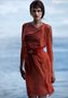 Стильное вечернее платье, дополненное кружевным кардиганом и поясом в цвет наряда. Модель выполнена из матовой непрозрачной ткани и украшена лёгкой драпировкой над линией талии, которая выделяется с помощью широкого пояса с бантом и блестящей брошью. Кардиган выполнен из тончайшего полупрозрачного кружевного полотна с изумительно красивыми вышитыми узорами.