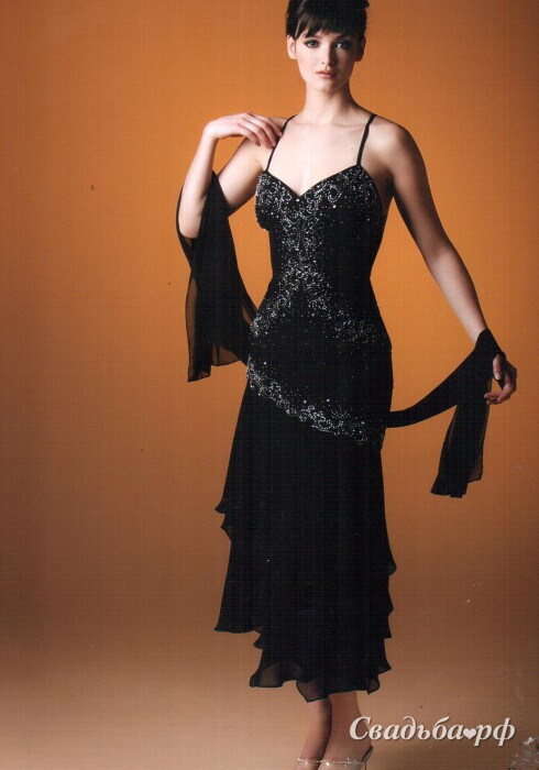 Элегантное черное платье с вышивкой по лифу. Изысканная вышивка, украшенная бисером и стразами, спускается вдоль корсета на линию бёдер и даёт начало юбке средней длины, выполненной из полупрозрачной лёгкой ткани и состоящей из нескольких оборок. Есть в наличии 42(36) размера. Уточните информацию по телефону 8(495)930-99-70.