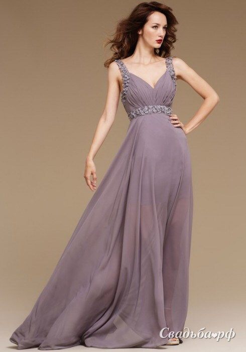 Элегантное вечернее платье с длинной широкой юбкой. Красиво очерченный лиф эффектно подчёркивает соблазнительность зоны декольте. Плотная короткая юбка до колена является основой для струящейся длинной юбки из полупрозрачной лёгкой ткани. Широкие бретели и пояс искусно расшиты бисером и бусинами соответствующего цвета.