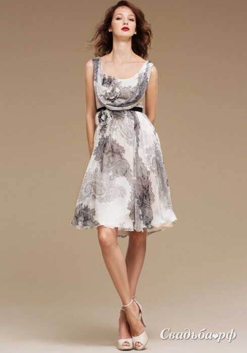 Романтичное вечернее платье из лёгкой ткани белого цвета с серо-чёрным растительным принтом. Округлый вырез эффектно продолжается драпировкой с объёмными цветами. Линия талии выделена контрастным чёрным поясом. Юбка – широкая, струящаяся, средней длины. В наличии 46(40) размер. Уточните наличие по телефону 8(495)930-9970.