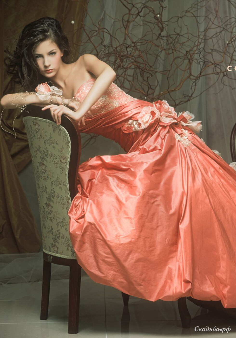 Корсетное платье небольшой пышности, драпированный лиф дополнен кружевной вставкой, наряд украшен нежными цветами.