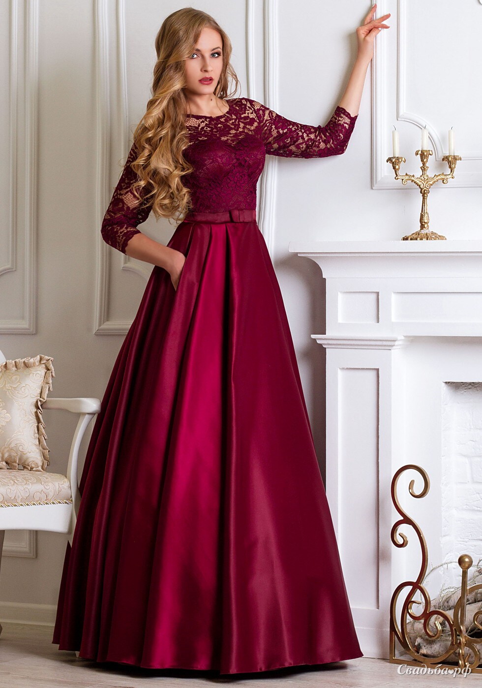 Роскошное вечернее платье для праздника. Кружевной корсет с рукавами и пышная атласная юбка — классическое сочетание. Платье подходит как гостям на пышном торжестве, так и главной героине. Подходит для выпускного бала. Может быть в других цветах