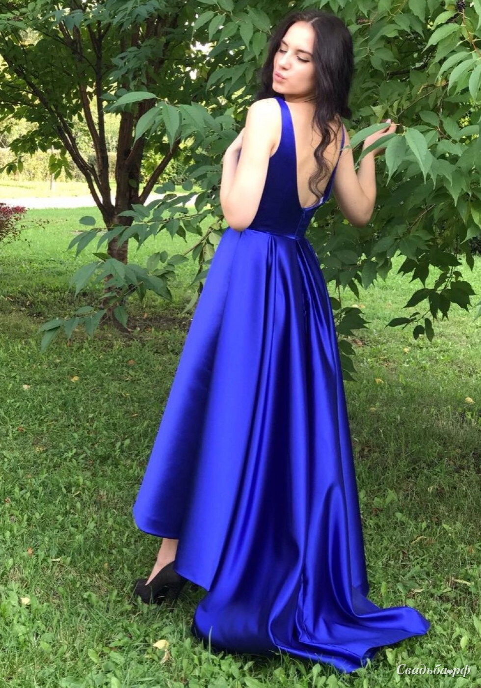 Очень красивое атласное платье каскадной длины. Верх платья очень оригинально исполнен, спинка с глубоким декольте.