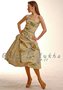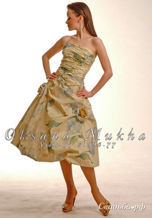 Изысканное вечернее платье с пышной юбкой. Открытый прямой лиф и корсет полностью задрапированы асимметричными складами. Роскошная пышная юбка с подборами украшена большими цветами из ткани. Модель представлена в нежном кремовом, романтичном голубом и оригинальном салатовом цвете. Большой выбор свадебных аксессуаров и свадебной обуви.