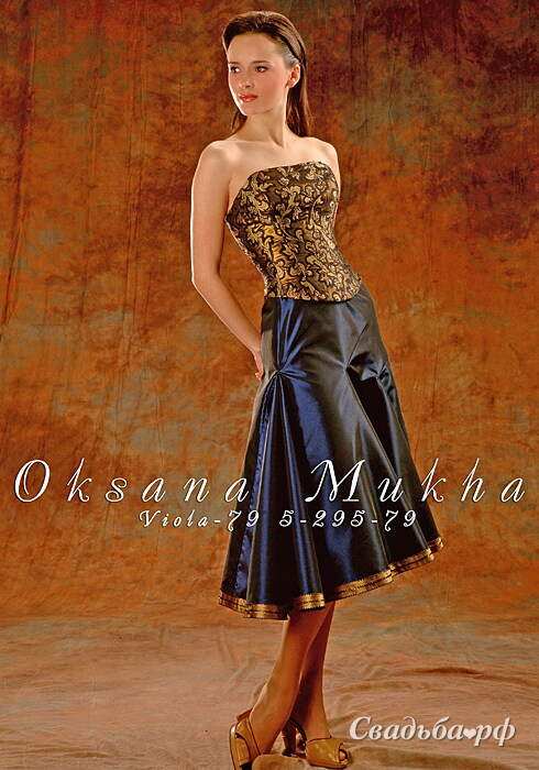 Великолепное вечернее платье в изысканном сочетании элегантного синего и роскошного золотистого цветов. Прямой открытый лиф и строгий корсет выполнены из плотной ткани с красивыми золотистыми узорами. Расширенная книзу однотонная синяя юбка по краю отделана золотистым кантом. Большой выбор свадебных аксессуаров и свадебной обуви.