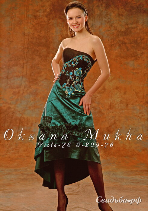 Изысканное вечернее платье в стильном сочетании таинственного чёрного и сочного изумрудно-зелёного цветов. Открытый чёрный лиф модели задекорирован невероятно красивой вышивкой в виде роскошных золотисто-зелёных цветов. Асимметричная юбка отделана кокетливой оборкой. Большой выбор свадебных аксессуаров и свадебной обуви.