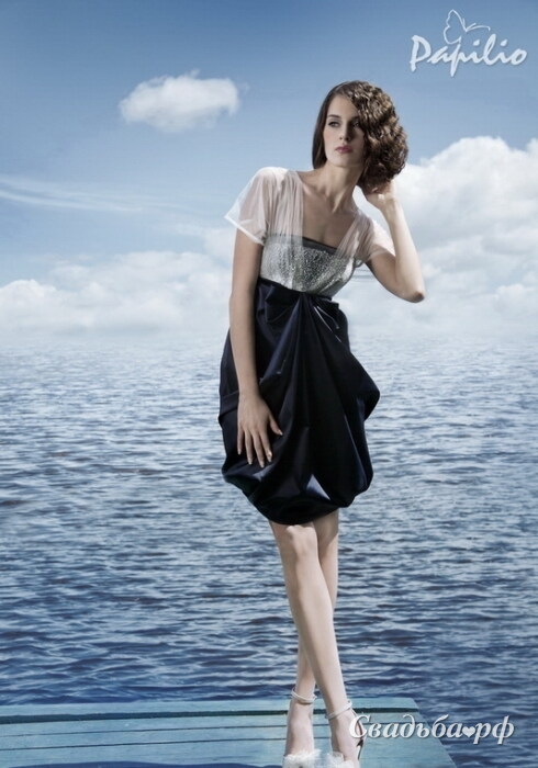 Вечернее платье необычного кроя от известного белорусского бренда Papilio подойдёт для любого торжества. Миниатюрный корсет с открытой зоной декольте дополнен полупрозрачной накидкой с короткими рукавами. Объёмная юбка оригинальной формы приоткрывает колени. Наряд подчеркнёт достоинства фигуры и скроет несовершенства.