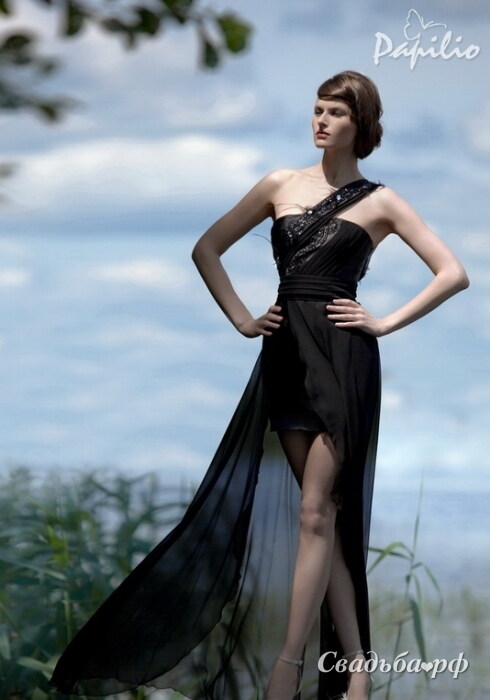Оригинальное платье от известного белорусского бренда Papilio создано для самых дерзких красавиц. Миниатюрный корсет со сверкающей вышивкой дополнен широкой бретелью, пересекающей зону декольте по диагонали. Талия подчёркнута поясом. Короткая юбка доходит до середины бедра. Полупрозрачный шлейф доходит до пола.
