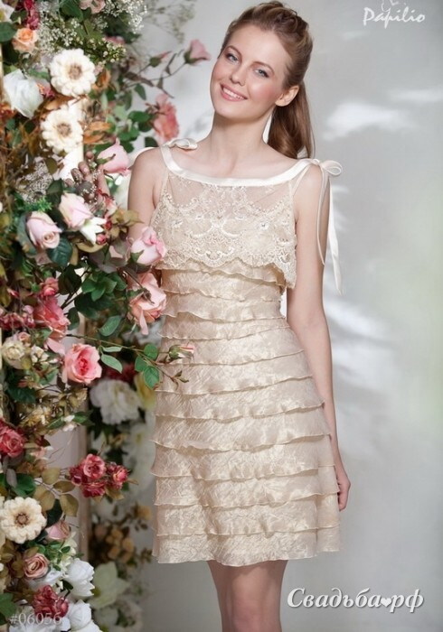 Изящное платье от именитого белорусского бренда Papilio представлено в нежном кремовом цвете. Кружевная вставка на груди дополнена атласной окантовкой. На плечах расположились миниатюрные бантики. Наряд состоит из небольших ярусов, придающих образу лёгкость. Такой крой помогает скрыть недостатки фигуры и подчеркнуть её достоинства.