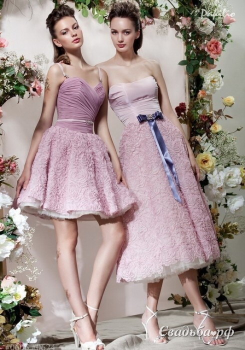 Нежный наряд от именитого белорусского бренда Papilio выполнен в духе 60-х годов. Драпированный корсет может быть как с тонкими бретелями, так и без них. Талия подчёркнута лентой. Пышная юбочка с оригинальными сборками в форме цветов также представлена в двух вариантах: короткая и удлинённая. Стильно и со вкусом!