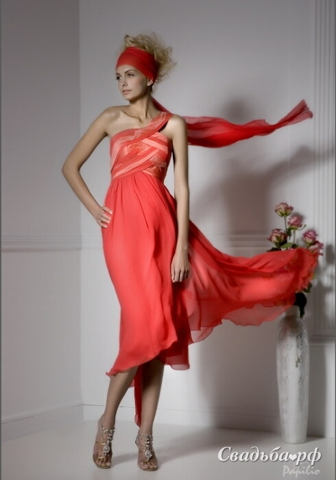 Струящийся вечерний наряд от именитого белорусского бренда Papilio выполнен из шёлка и лёгкого шифона. Верх платья представляет собой переплетённые полосы ткани, переходящие в единственную бретель. Юбка свободного кроя доходит до середины голени. Благодаря чуть завышенной талии, платье зрительно вытягивает силуэт.