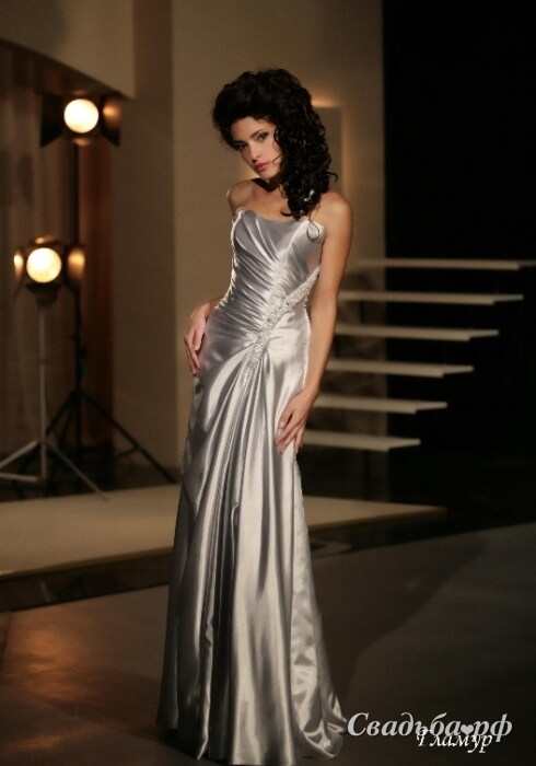 Восхитительное серебристое вечернее платье. Складки мягкой драпировки открытого лифа и корсета сходятся в плавную линию, расшитую стразами и бисером. Длинная широкая юбка спокойными мягкими волнами ниспадает на пол. Создать образ нежной, но чувственной и сексуальной королевы бала в таком платье очень легко.
