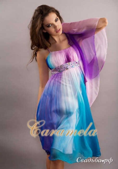 Удивительно нежное вечернее платье средней длины. Лиф искусно задрапирован легчайшей тканью. Под грудью - декоративный поясок, расшитый стразами. Юбка - свободная, струящаяся, длиной до середины колена. Сиренево-розово-голубые переливы натурального шелка делают эту модель особенно изысканной и очаровательной.