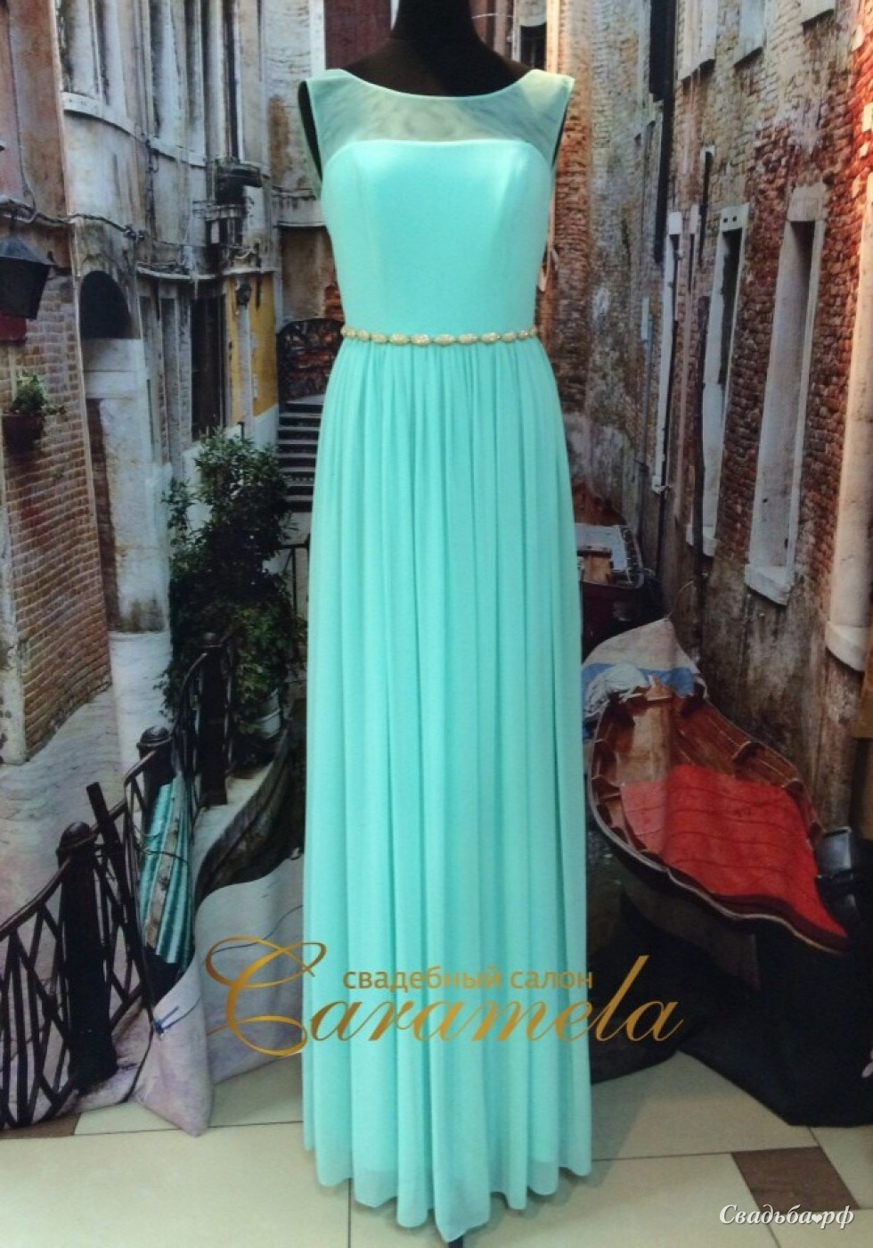 Вечернее платье в мятном цвете с закрытым верхом.