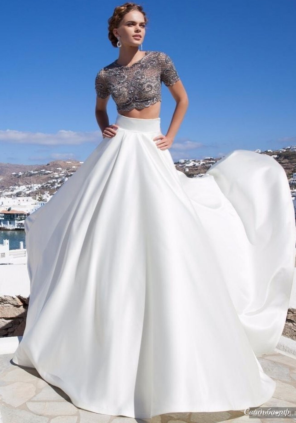 Оригинальный вечерний комплект из двух частей: укороченный топ с небольшими рукавчиками и длинная юбка из атласа. Верхняя часть наряда закрыта и оригинально расшита кристаллами Swarovski, идеально сочетается с великолепной юбкой, переходящей в небольшой шлейф. Фантастический образ, достойный современной модницы с безупречным вкусом!