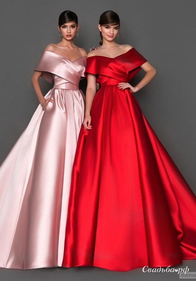 Атласное платье A-силуэта с приспущенными плечиками и карманами. Верх платья декорирован сборкой. Юбка пышная со шлейфом.