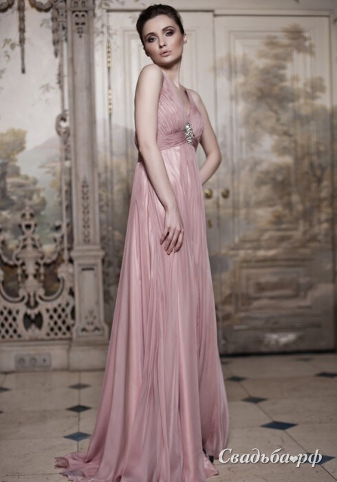 Нежное вечернее платье от лучших итальянских дизайнеров придётся по душе настоящим романтикам. Завышенная талия украшена сверкающей брошью. Бюст подчёркнут драпировкой. Такой наряд с длинной юбкой свободного покроя зрительно вытягивает силуэт и придаёт образу лёгкость. Данная модель представлена в салоне на Чистых Прудах.