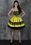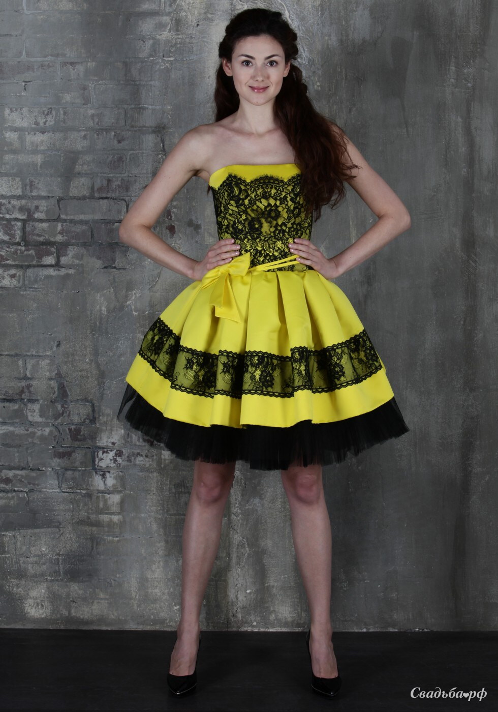 Пышная юбка и зауженная линия талии выделяют тонкую талию, а декорирование черными кружевными вставками делает модель особо незабываемой.