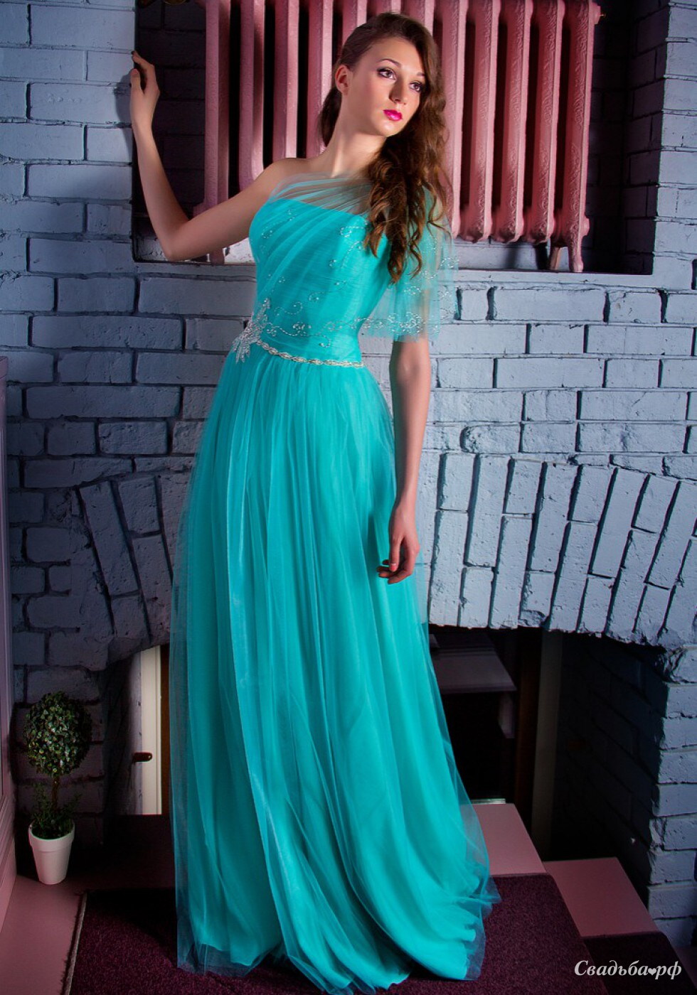 Великолепное платье нежно-мятного оттенка с необычным верхом и с легкой фатиновой юбкой.