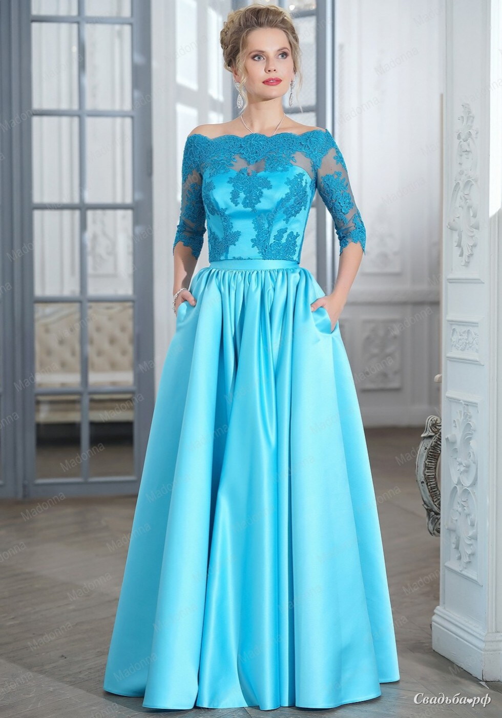 Вечернее платье бирюзового цвета, шикарный кружевной верх и потрясающая атласная юбка придает этому платью неповторимость и красоту. Новинка сезона.
