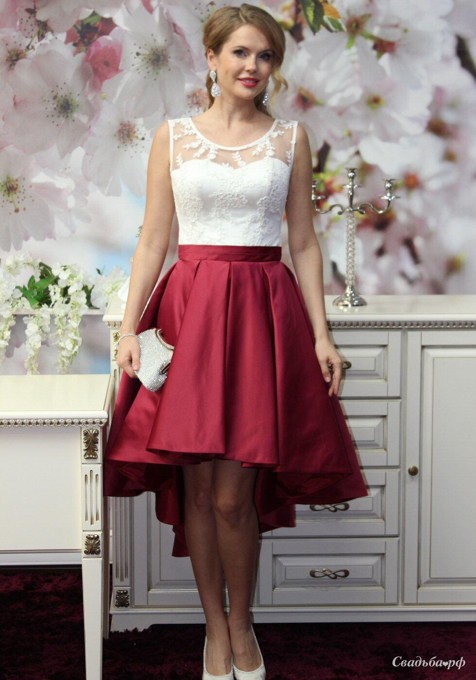 Потрясающее платье на выпускной! Бордовый атлас изумительно сочетается со светлым кружевным верхом. В этом платье вы будете неотразимы!