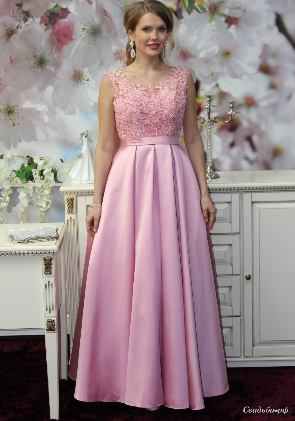 Шикарное платье нежно-розового оттенка с потрясающим расшитым верхом и атласной юбкой моментально привлечет к вам внимание!Тонкий пояс идеально подчеркнет вашу талию.
